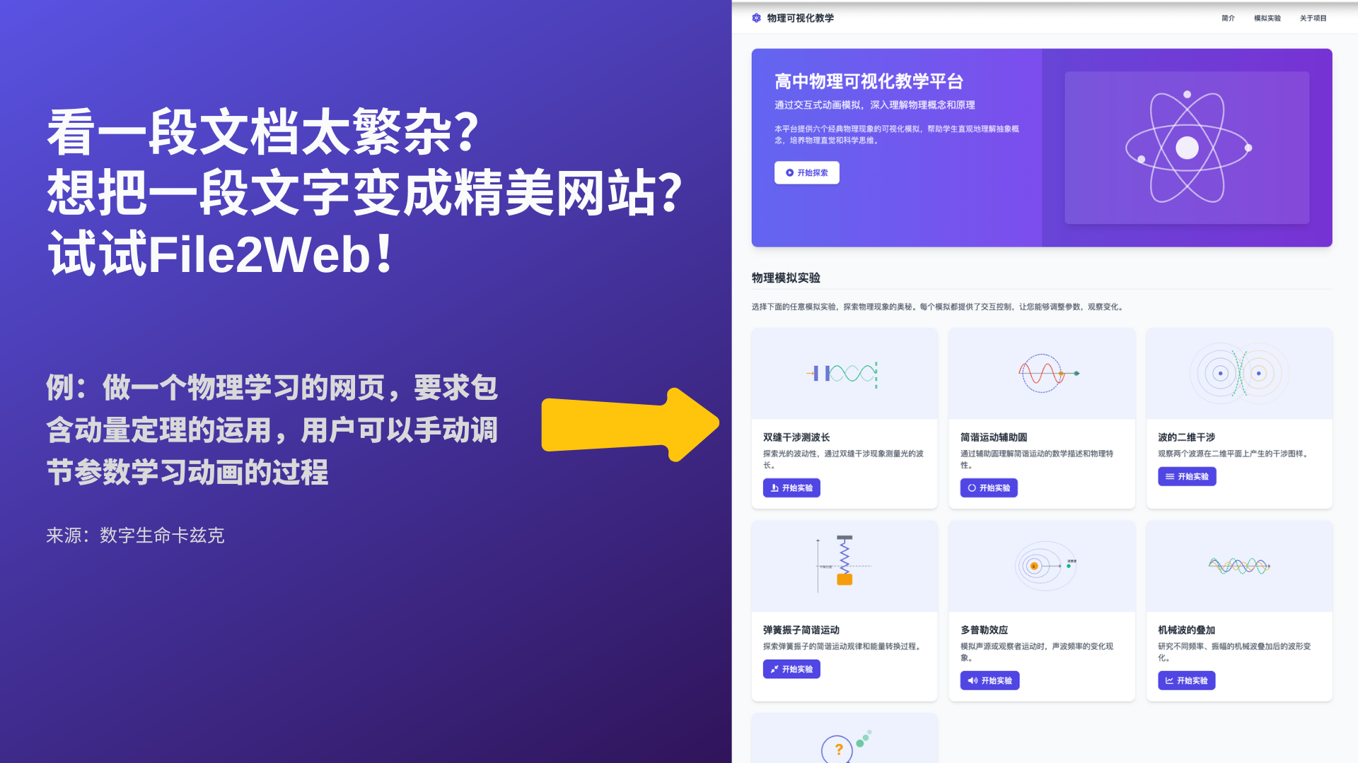 File2Web 帮助您轻松将文字内容转换为精美的网页。无需编程知识,只需上传文字,AI 将为您生成专业的网页。